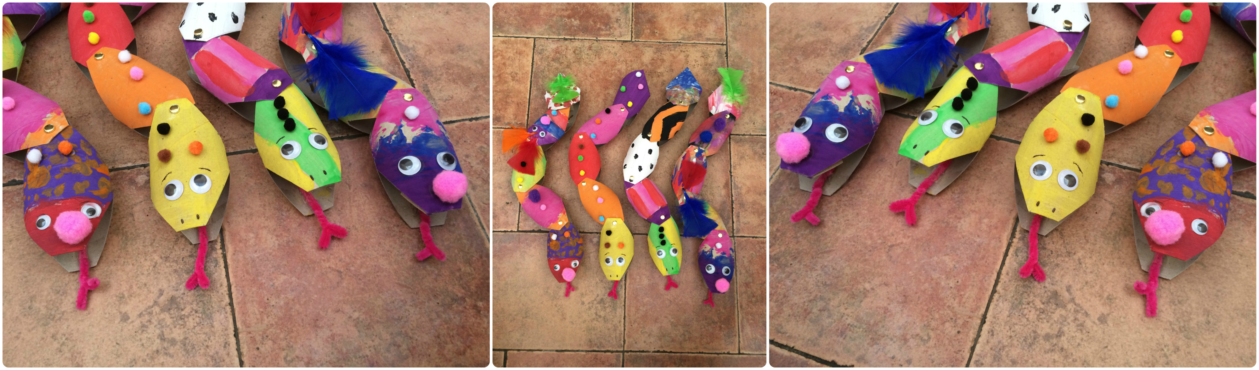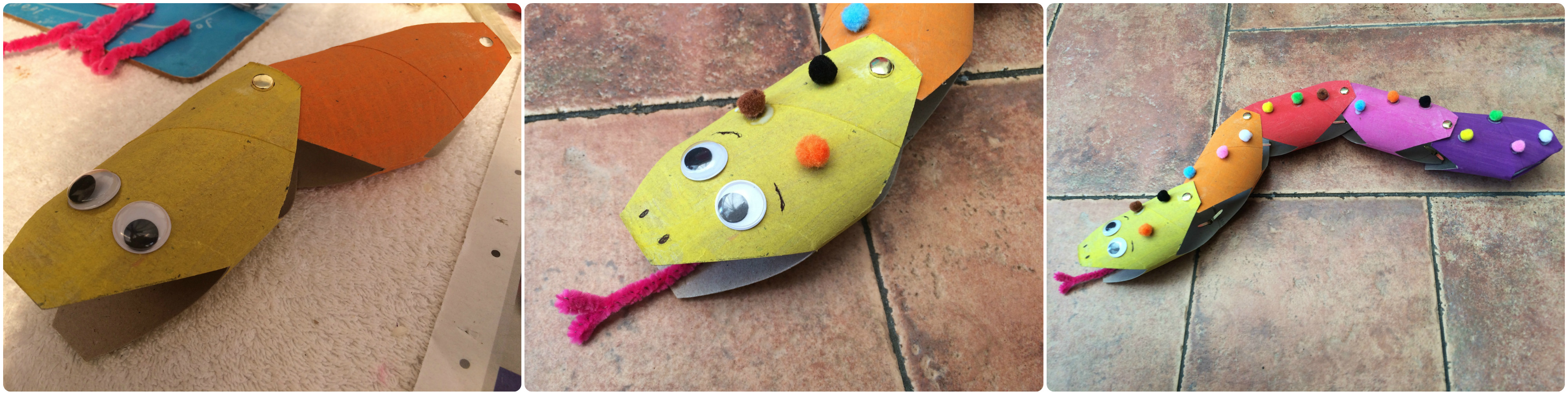 Then using the split pins I put the snakes together, getting the kids to select what order they wanted the rolls to go! Then I stuck in the tongue.