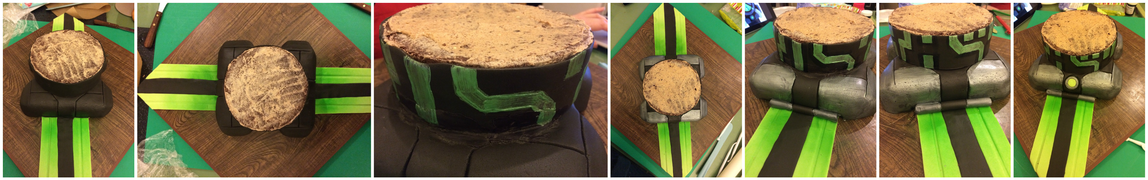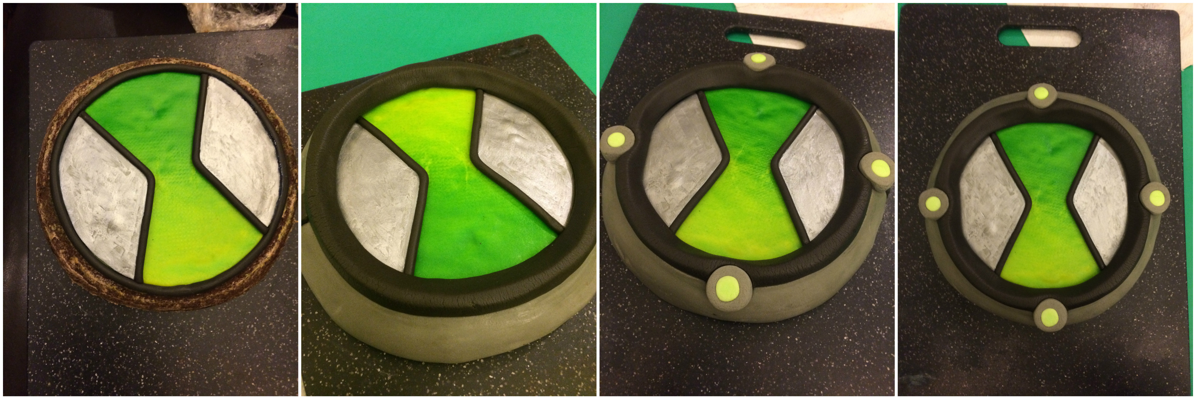 Added the first layer of fondant icing and etched in some of the Omnitrix pattern, and quite quickly the cake was taking shape.