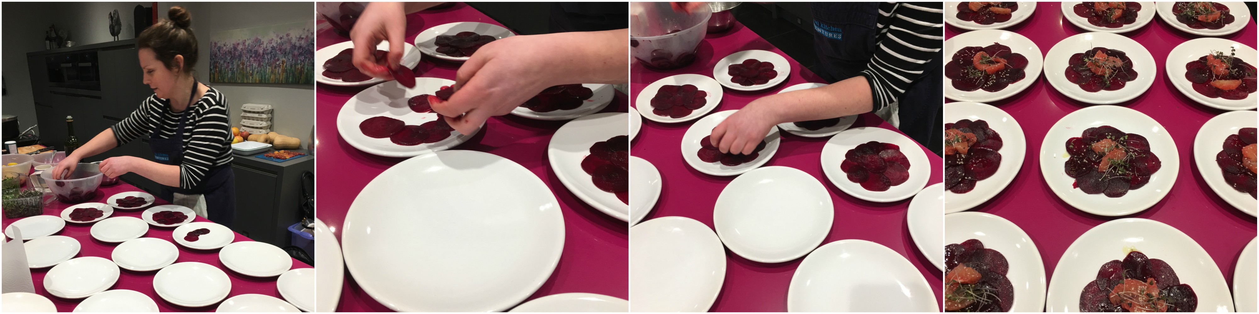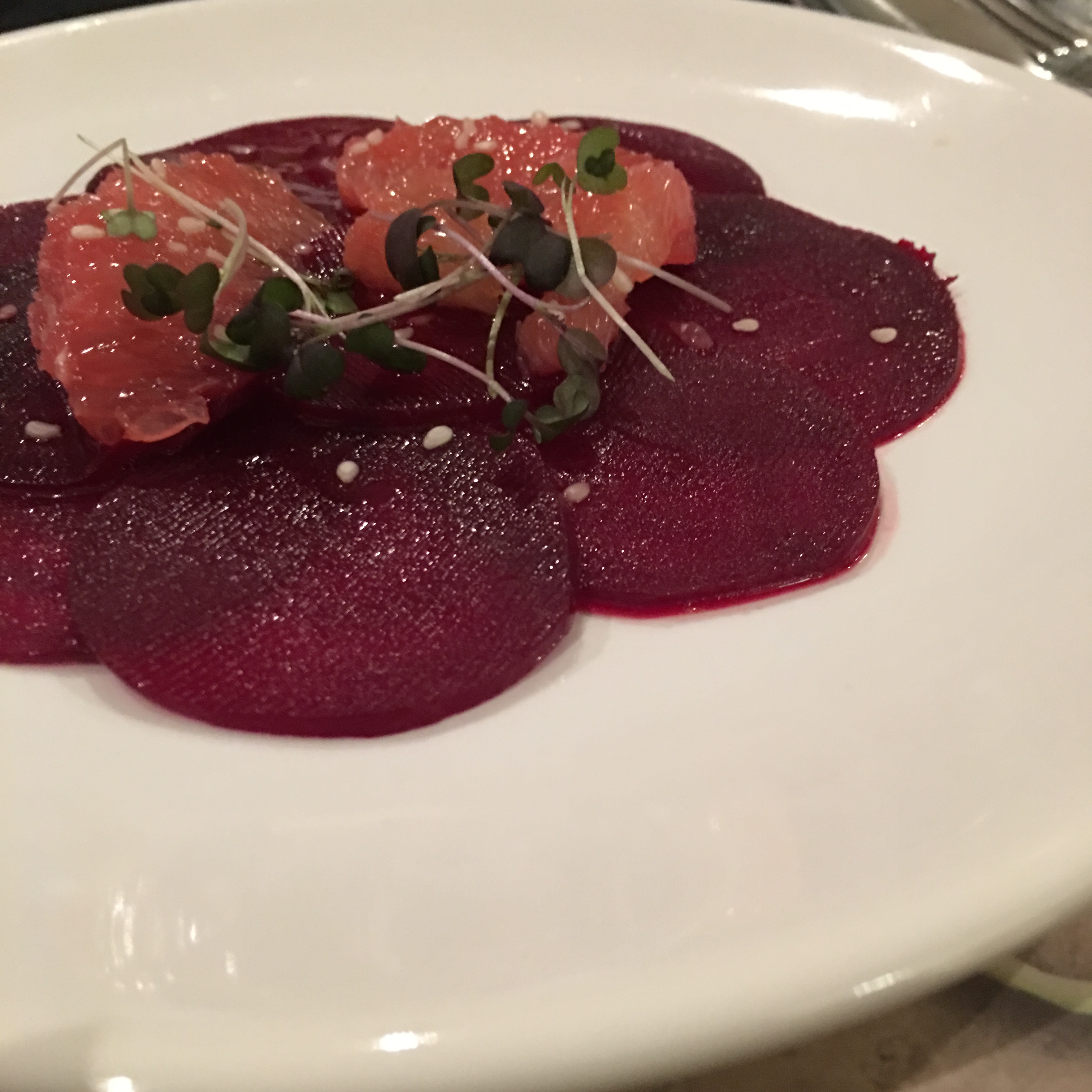 Starter: Beetroot and Pink Grapefruit Carpaccio (this was a take on a meat or fish carpaccio where the meat or fish is served raw and thinly sliced – in this instance, the beetroot was sliced exceptionally thin)