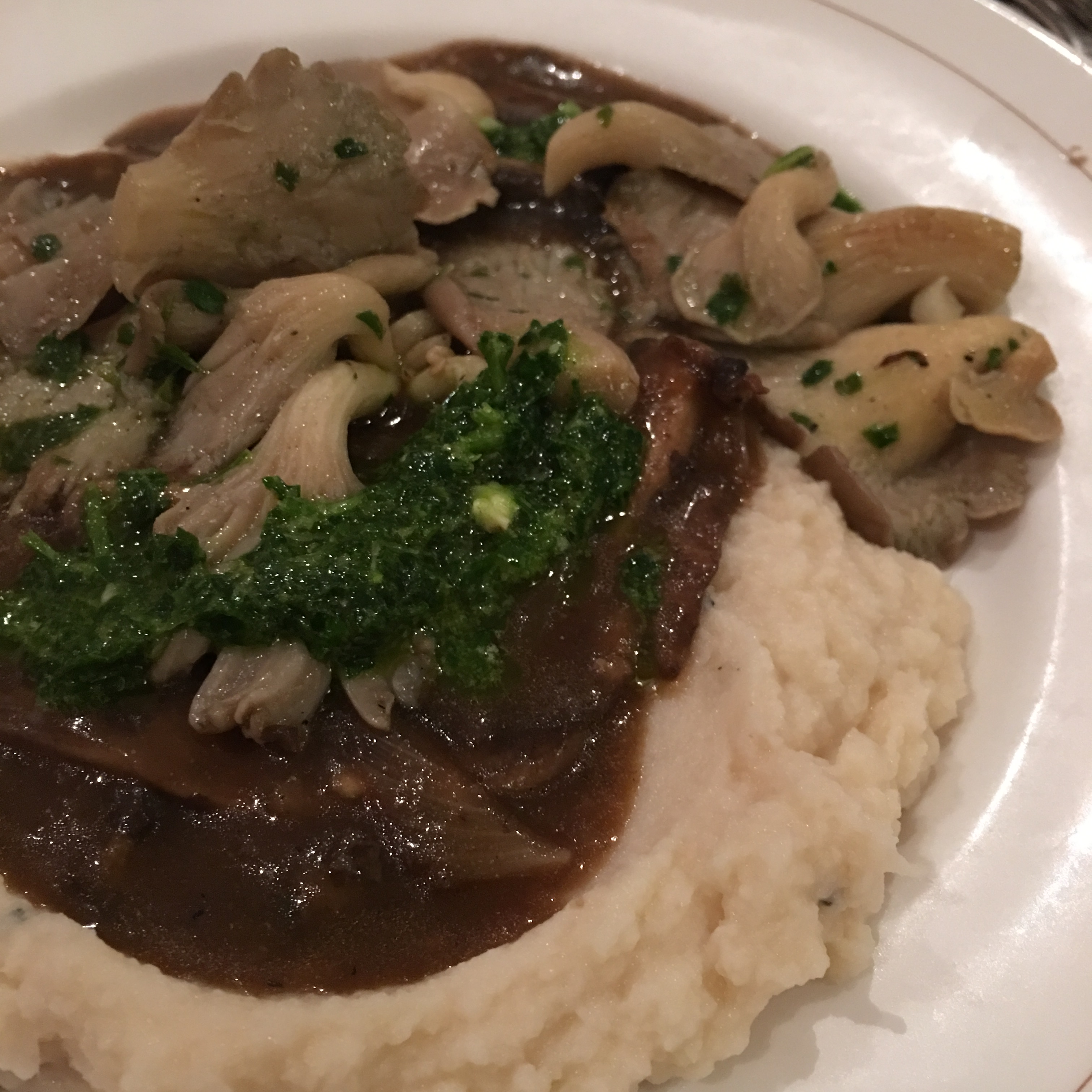 Main: Mushroom Stew over Celeriac Puree with Herby Drizzle, Side Salad