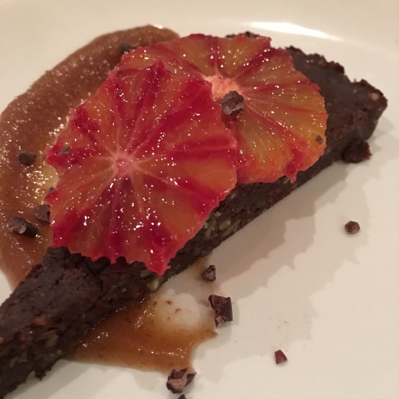 Dessert: Cacao Raw Brownie with Salted Date Caramel and Blood Orange