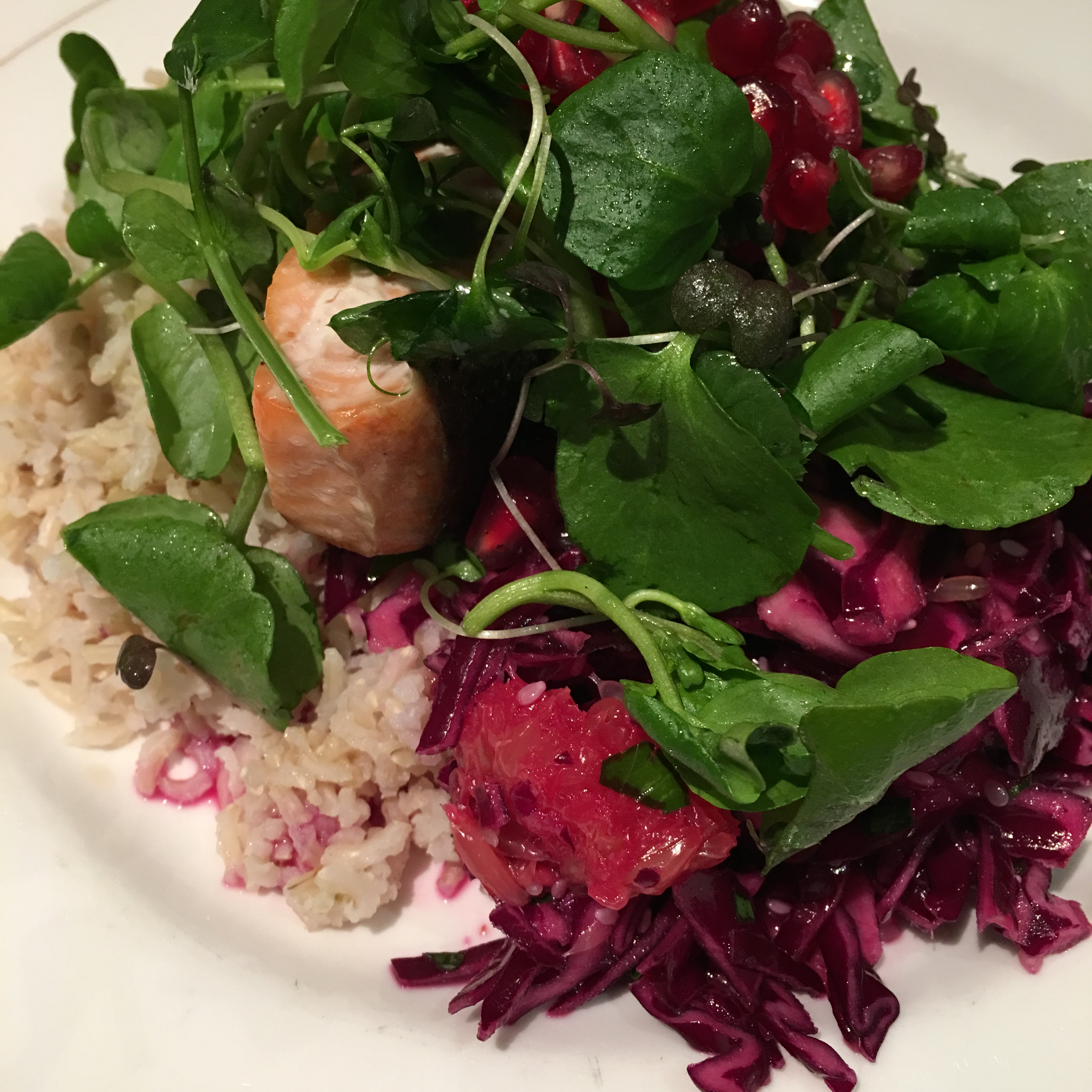 Main: Sticky Pomegranate Salmon with Red Cabbage and Citrus Slaw, Rice