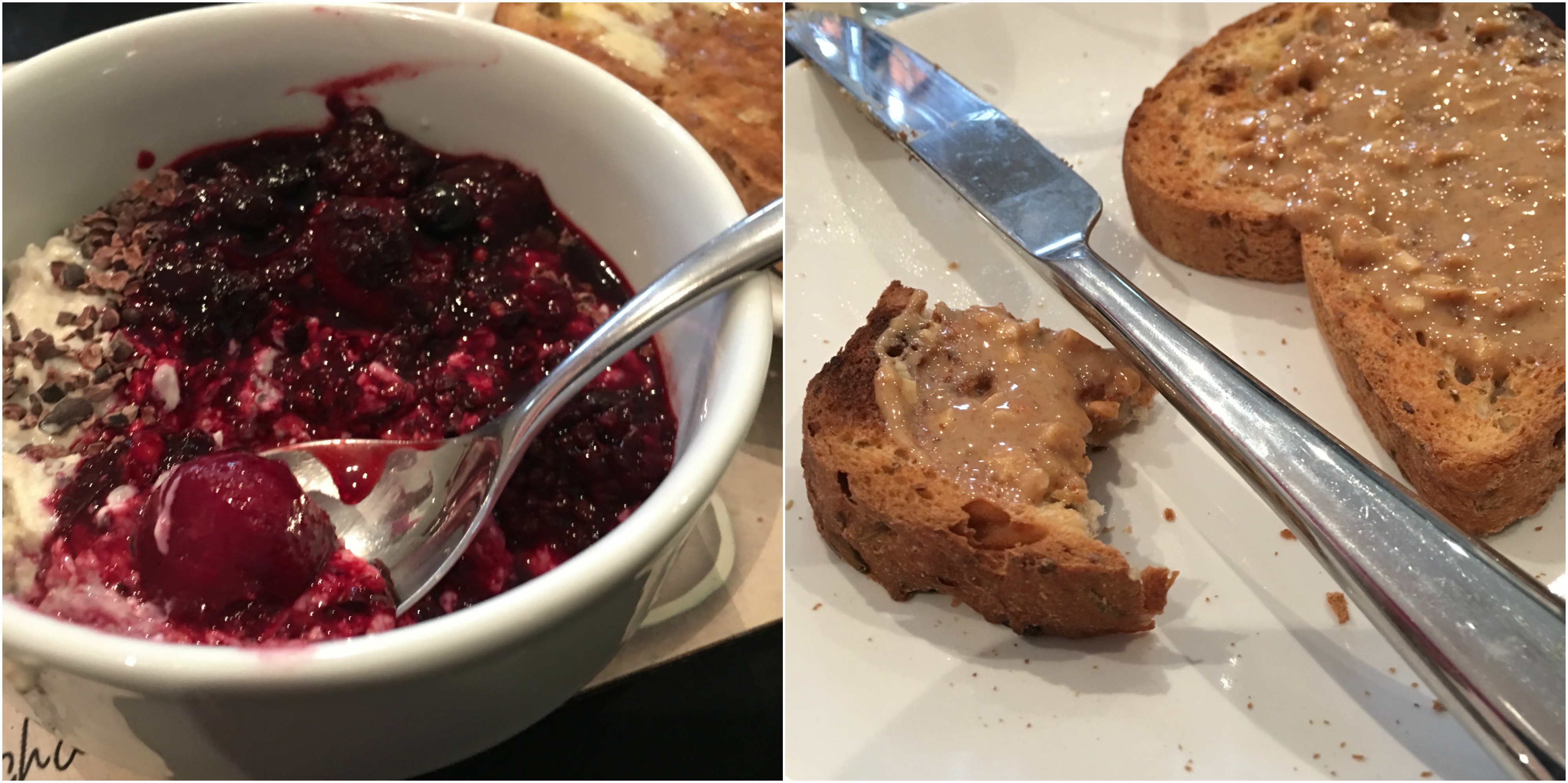 The Bircher was like a super awesome overnight oats and was served cold with hot compote, and I added some cacao nibs, and it was delectable. My mouth is actually watering as I write this and remember it. I also had some gluten-free toast with crunchy peanut butter. It was a superb way to start the day!
