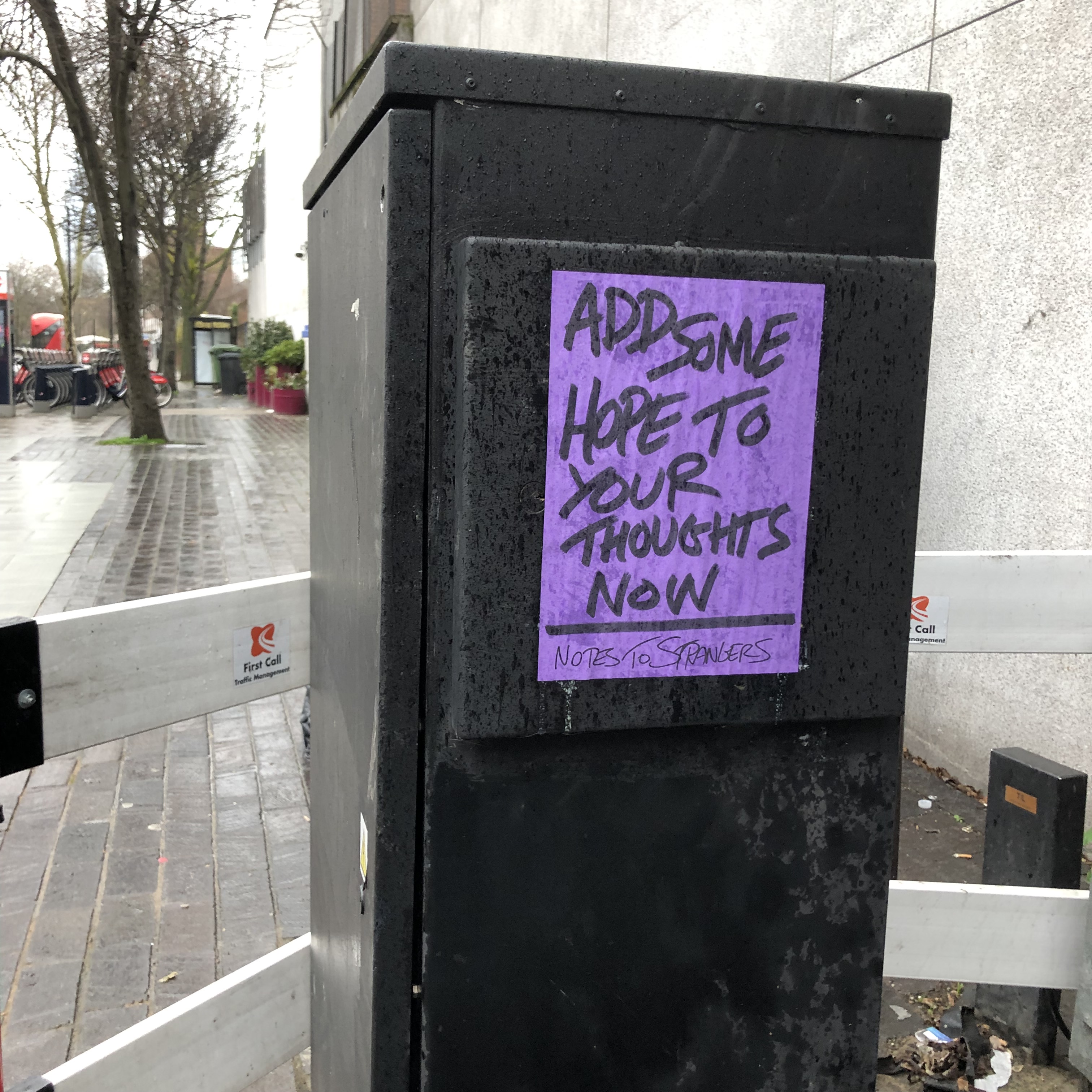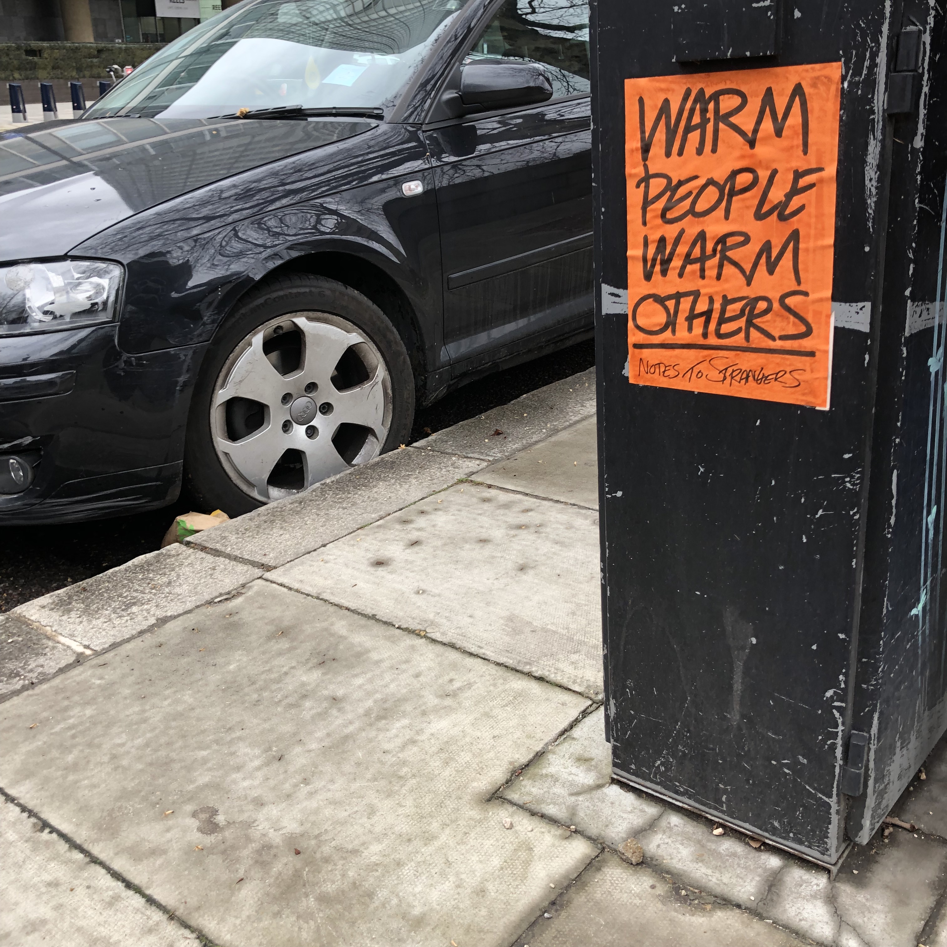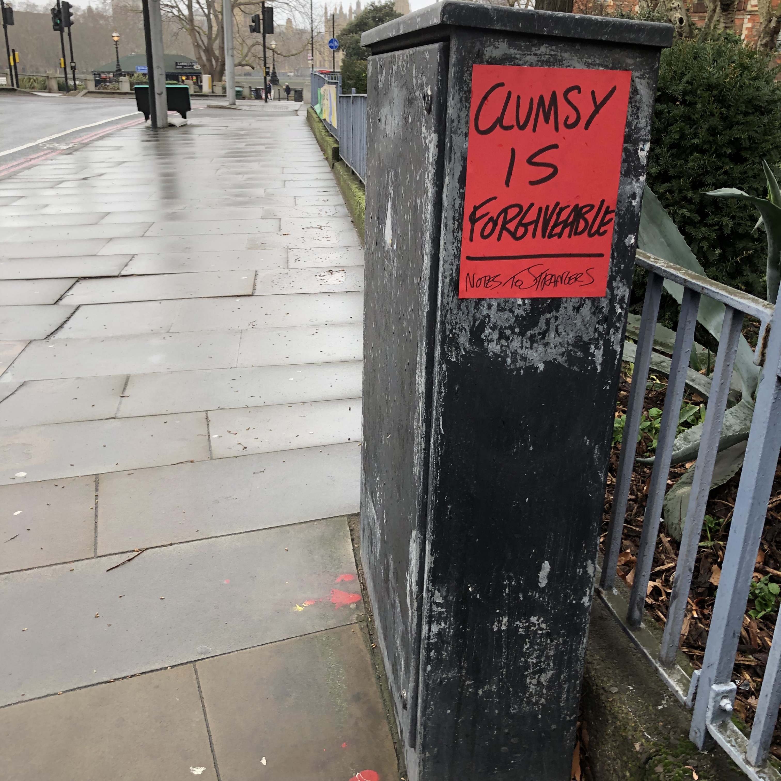 So on a rather damp and extremely windy Sunday afternoon, a group of strangers met across the road from the Tate Britain, a spot specifically chosen to start the walking tour as it’s here Andy started posting the Notes to Strangers – so a poignant place to start our journey, discovering new Notes to Strangers along the way that Andy had specifically written for the tour and see what discussions/conversations they triggered within our group.