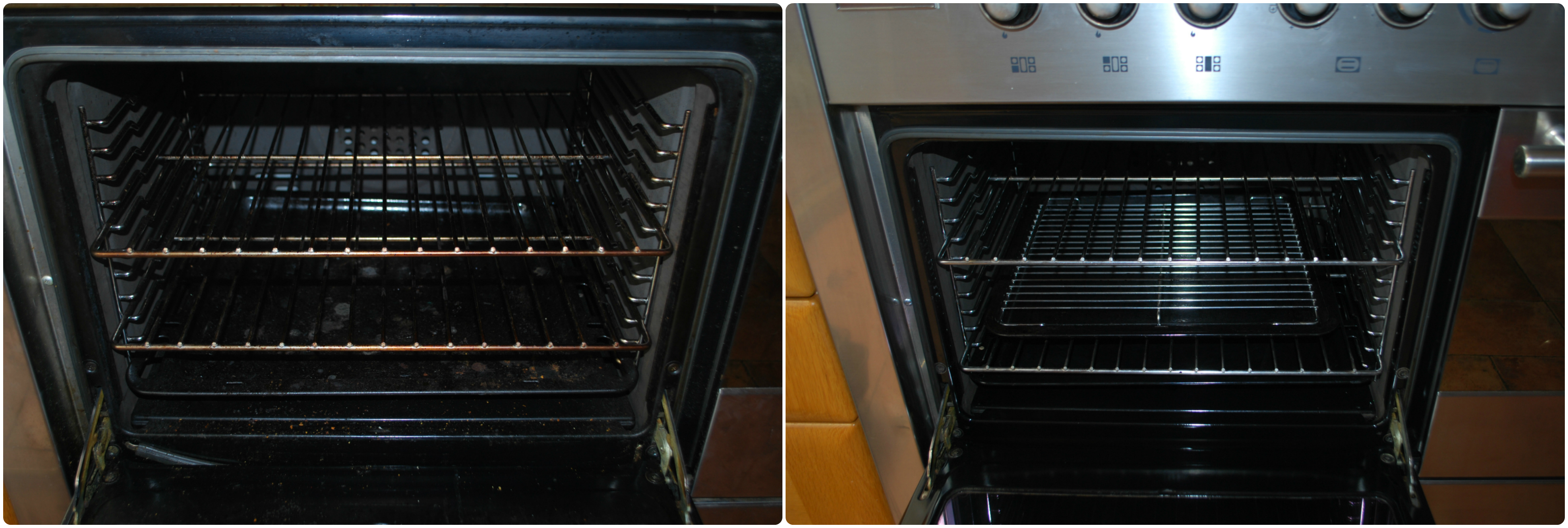 Oh my goodness – you can see through the glass!!!You can see the tiles through the door!!!So shiny!!!Ok, the photo on the left makes us look gross, but hey it’s clean now!Look – the metal racks are so clean!Looks like new!The racks are silver now, not brown!Such a difference!Looking good!Now that’s what you call clean!From gross to lovely!Could actually use the hotplate now!